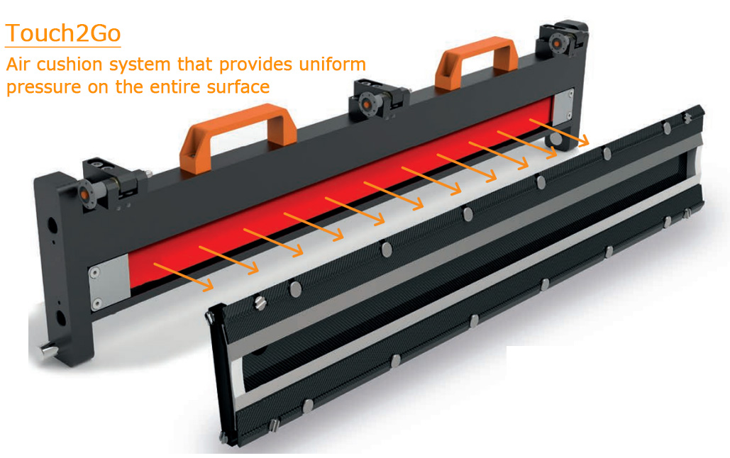 The proprietary "Touch2Go" pressure system ensures uniform pressure across the entire surface of the anilox roll using low air pressure.